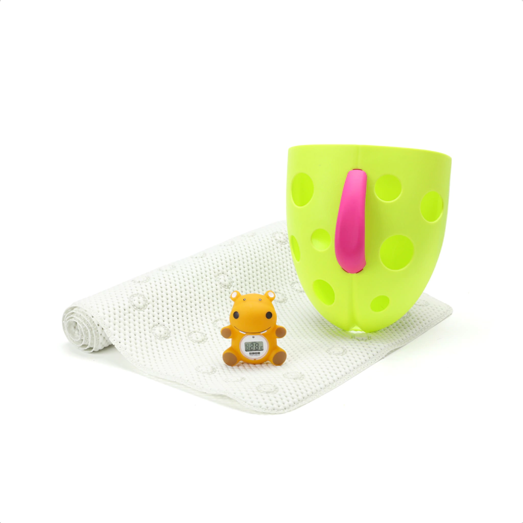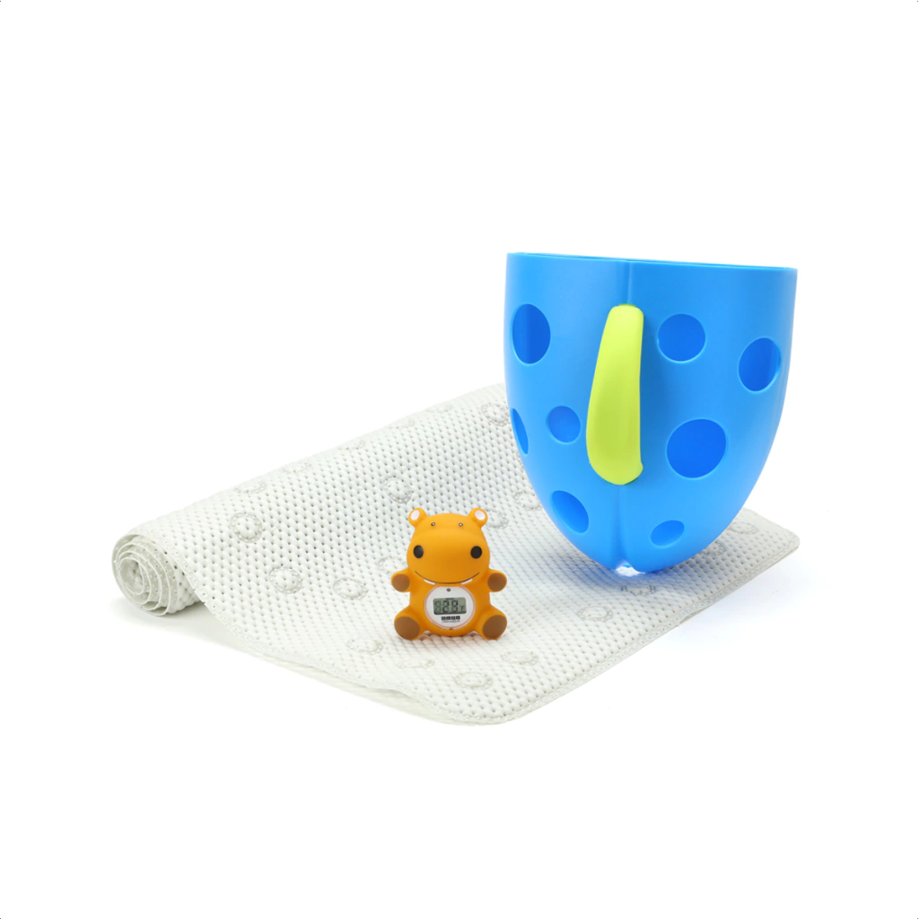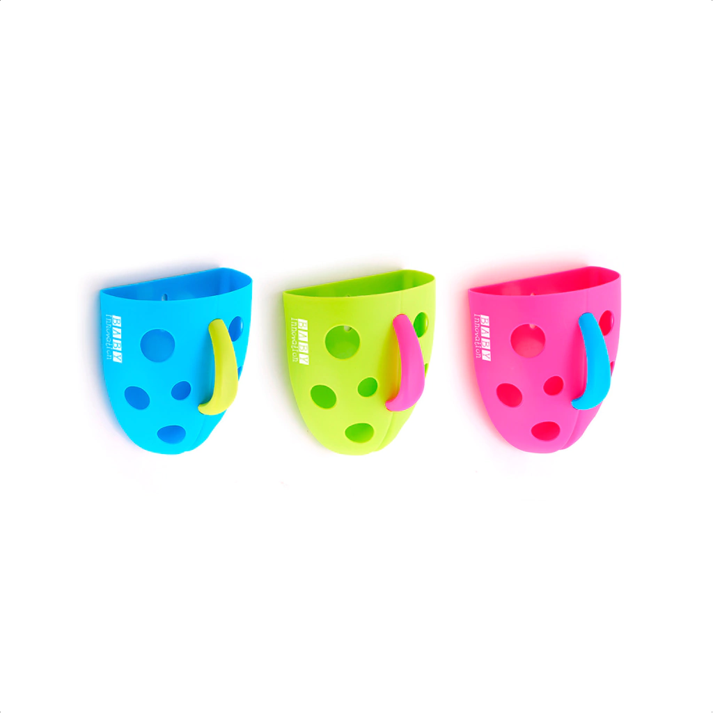 Porta Objetos: disponible en tres colores, ideal para guardar los objetos y juguetes que que tu bebé usa a la hora del baño, práctico sistema de fijación que permite adherirlo sobre los azulejos del baño las veces que sea necesario, cuenta con orificios que permiten el correcto flujo del agua facilitando su limpieza y la higiene en su interior